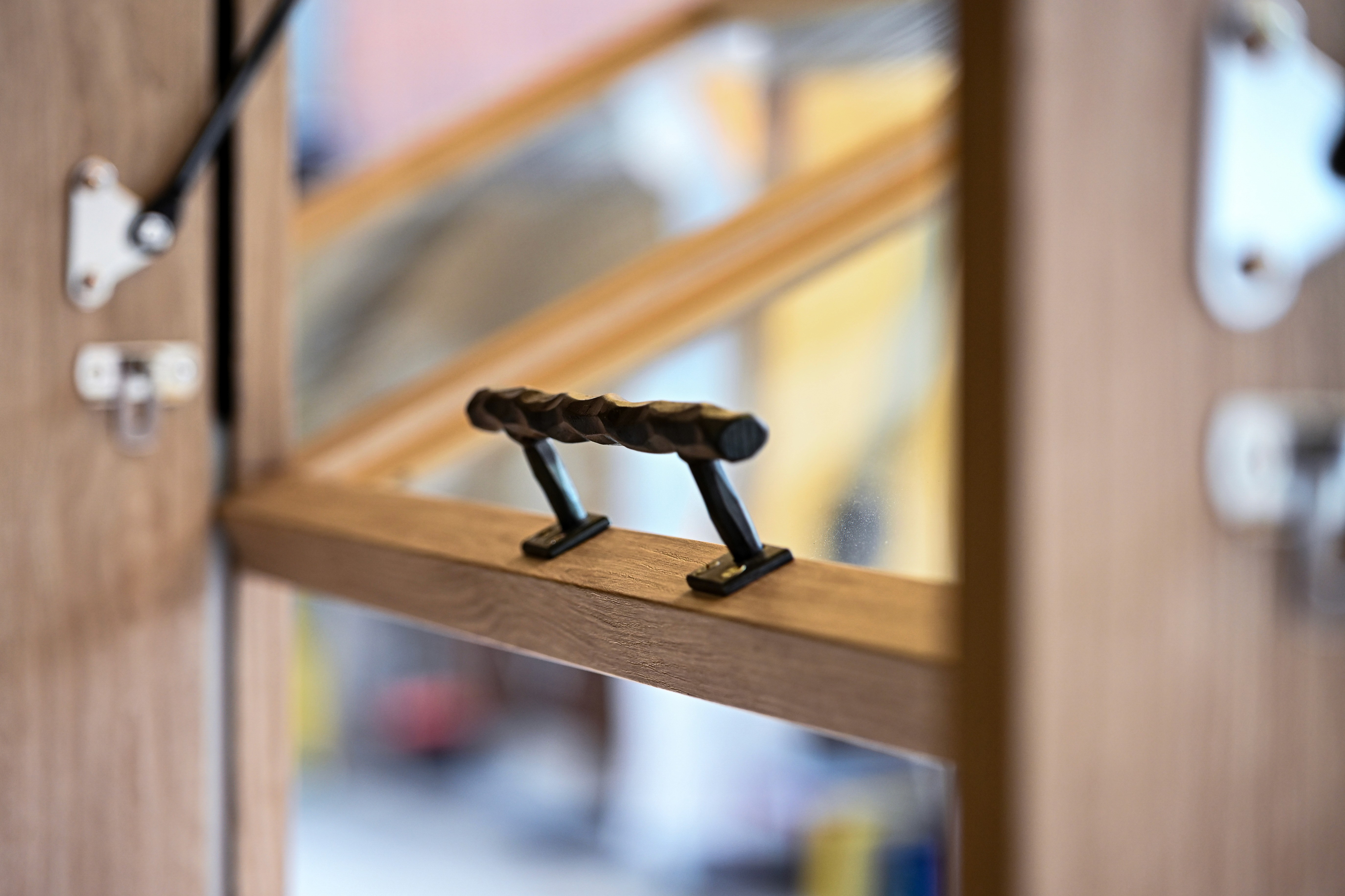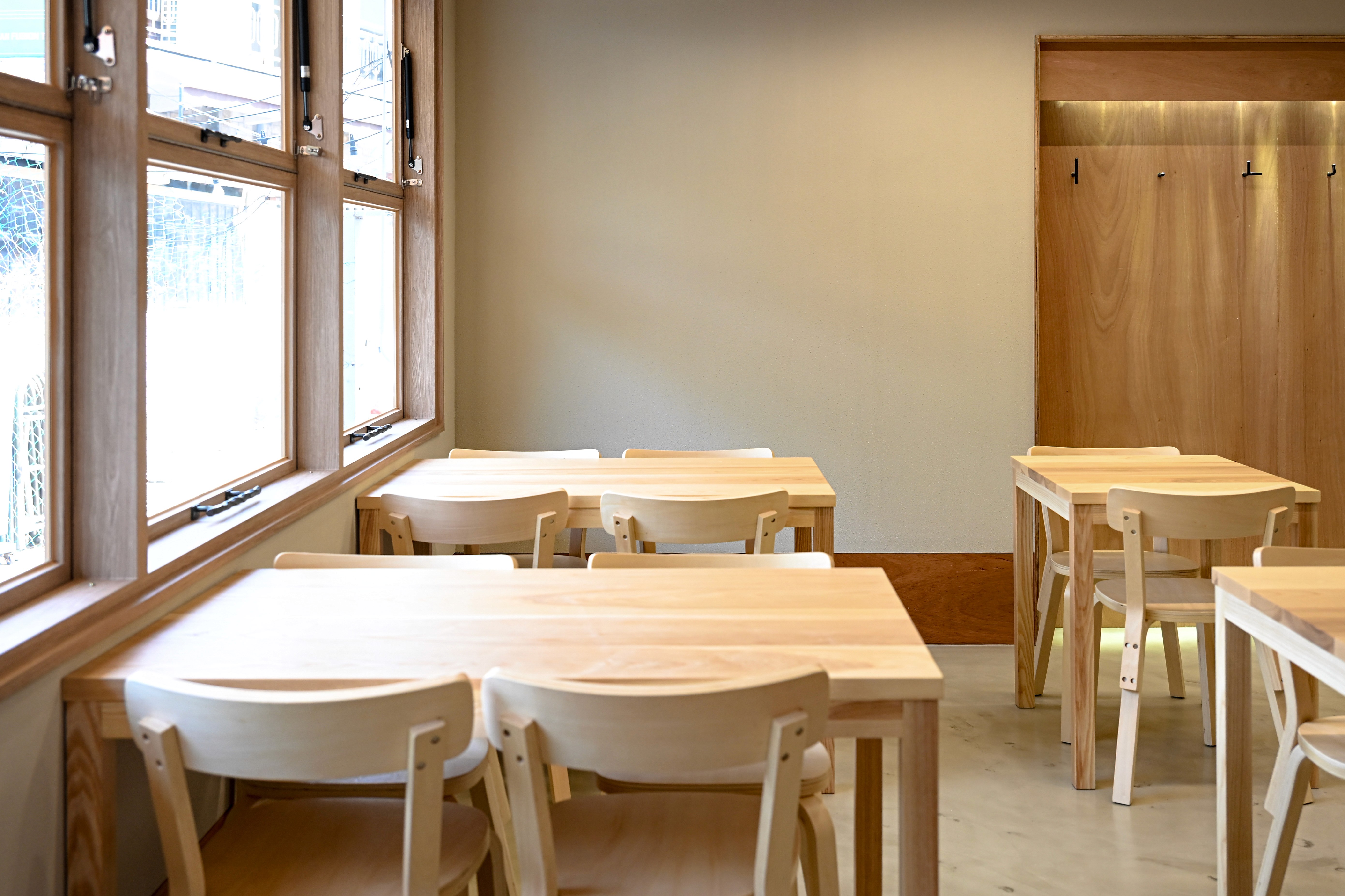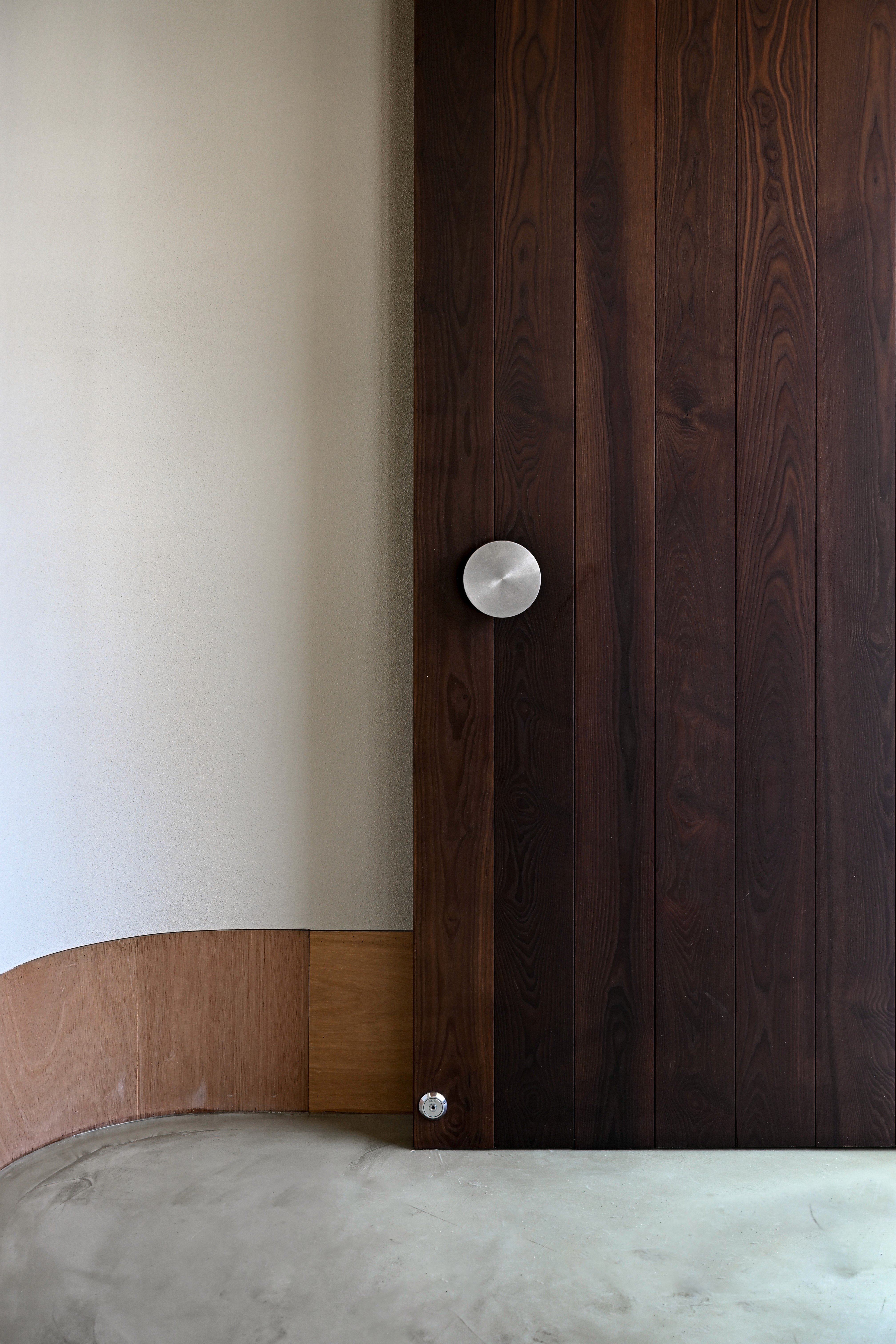 실내 한쪽의 합판 천장과 반대쪽의 노출 콘크리트 슬라브가 높이 차를